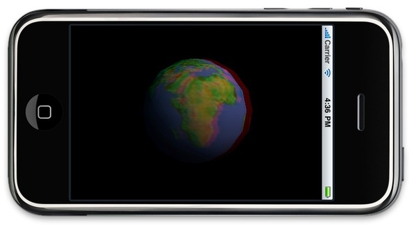 まずは、地球を回転表示するOpenGL ESのサンプル・プログラムを、glFrustumを使うことで左右の目から液晶表面を介して見える画像を自然な見え方にした上で、両眼分の画像を作成し、さらに、アナグリフ(赤青メガネ)用画像として色変換をした上で、iPhone画面にアニメーション描写するようにしてみたののが、下の動作画面になります。