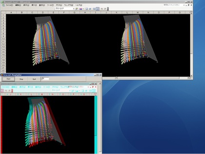 そこで、今日は同じデータに対して異なる視点から描画した2つのグラフを並べたMicrosoft Excelのウィンドウを、前回作ったソフトウェアで強引にアナグリフ立体画像にしてみることにしました。そのようすが、下(と右上)のスクリーンショットになります。