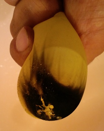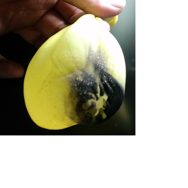 ところで、この実験をした後の風船を眺めてみると、「水風船をライターの炎であぶると何が起こるか考える!? 第4回」と同じようなススの付き方になっています。面白いものです。ちなみに、実験条件に関する情報としては「外気温は約30℃、加熱源はライターで、途中からゴムが焦げる臭いがしていた、風船は(株)タイガーゴム製(世界初、新素材天然ゴムにより、ゴムの材質が非常によくなりましたとの記述あり)」ということです。