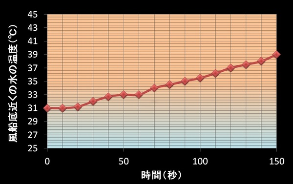 その(風呂に入りながら行われたという)実験結果を示したグラフが下に示したものになります。グラフの横軸は、炎で熱し始めてからの時間(秒)で、縦軸は風船の底近くの水温度(℃)になります。数値だけ見ると、「大体こんなものだろう」と思える温度変化になっています。前回の伝熱シミュレーション計算結果と結果が異なっているのは、前のシミュレーション計算では対流の影響を考慮していないことなどが大きな原因かもしれません。