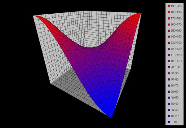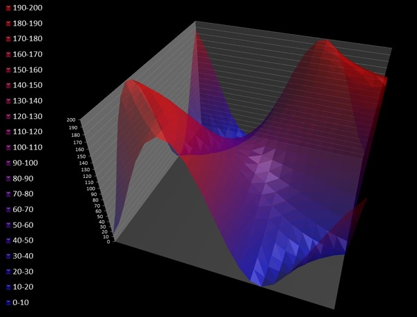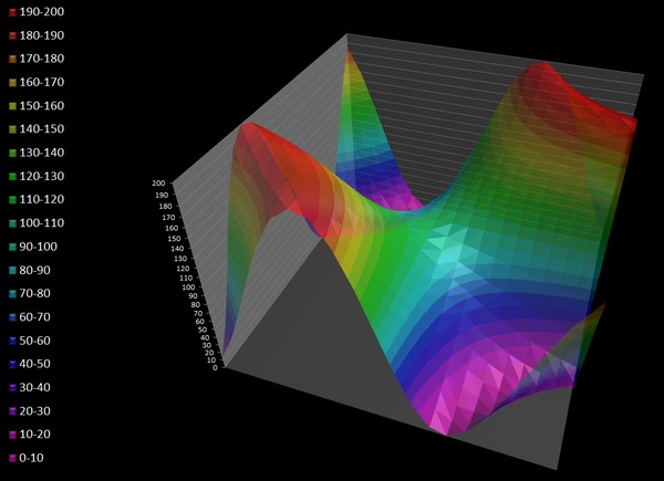 このアプリケーションを使うと、開かれているエクセルの中のチャート(複数のチャートがあれば、一番最初に作成したもの)を、等高面グラフや濃度グラフを、スペクトルカラー風にしてみたり、炎風の色表現にしてみたり、青→赤の色表現にしてみたり、と色々なことができます。…あるいは、Bitmapファイルを適当に作ってやれば、左端がグラフ中の下端の色として扱われ、一番右端の色が上端の色として使われたグラフに変えることができます。つまり、自由自在にチャートの色を簡単にカスタマイズすることができます。しかも、縦軸の最大・最小・分割幅なども設定することができるようになっています。