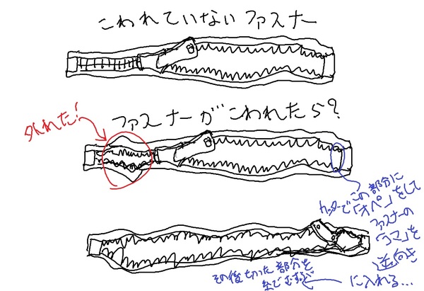 しかし、このやり方はどうも乱暴に思えます。ジッパーやリュックにメスを入れずとも、おそらく、もっと上手い不具合が生じたジッパーを直すやり方があるはずに思えます。一体、ジッパーが上手く動かなくなった時には、どうすれば良いのでしょう!?