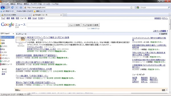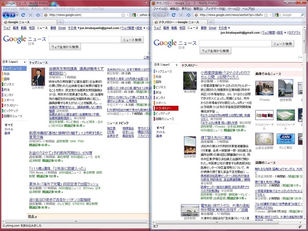 そこで、ためしに、同じ2つのサイトを(それぞれ独立のウィンドウで)ブラウザーで開き・眺めてみました。それが、下の画像です。上の画像がThinkPad Edge 13”の画面をキャプチャしたもので、下の画像がThinkpad X61Tabletの画面例です。横幅はほとんど同じですが、縦長さが結構違います。この画面の縦長さ・広さの違いを気にするか・気にしないかは、人それぞれの「ノートPCを使って何をするか」や「本人の志向」によるかもしれませんね。