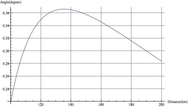 そこで、「富士山を関東平野から眺める時、富士山からの距離に応じて、丹沢(の山)より富士山がどのくらい高く見えるか?」を調べてみました。富士山と(関東平野から見て富士山の手前に位置する)丹沢の山の高さ関係(仰ぎ角の差分)が、地球の丸さを反映しつつ、どのようになるかを計算してみました。それが下のグラフです。横軸は富士山からの距離(km)、縦軸は丹沢の山より富士山が仰ぎ角で何度程度上に見えるかを示しています。また、横軸の最大値は200kmになっていますが、このくらいの距離が「富士山が地平線の下に隠れ・見えなくなってしまう限界距離」です。