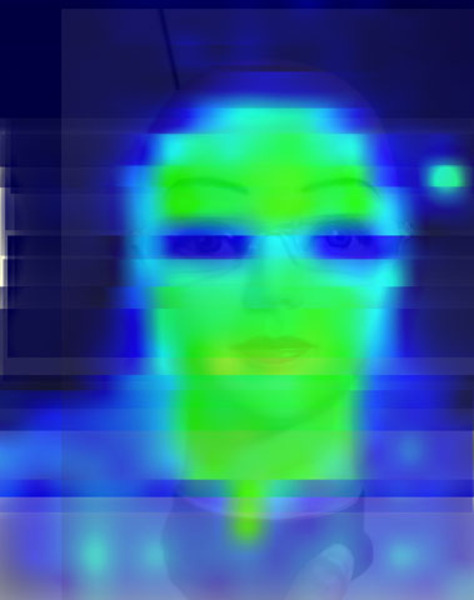 一万円で買ったUSBサーモグラフィカメラ(キット)の画素数は、小アイコンをさらに4分割したくらいの「16×4ピクセル」に過ぎません(たとえば、右の画像を眺めれば、とてもボヤッとした温度分布画像であることがわかります)。けれど、サーモパイルアレイのピクセル数が極めつけに少ないとしても「その分、数多くのショットを撮ればいいのさ!」というわけで、自分の顔を何枚もサーモカメラで撮影し、少しは高解像度の熱分布写真を作り出してみました。