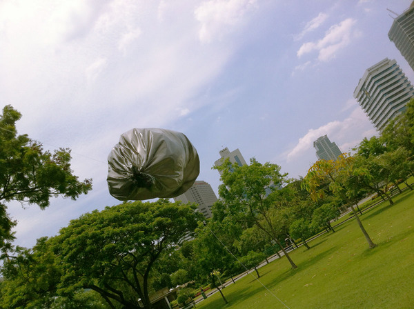 ふわふわ浮き浮き地上を眺める空撮をしたくなって、熱気球で空撮に挑戦してみました。公園の草むらの上に黒ポリ袋を広げて空気を入れ、超小型Wifiカメラを縛り付け、そして、無慈悲に強烈な日光を浴びながら、ポリ袋がWifiカメラを持ち上げるのを待ってみました。