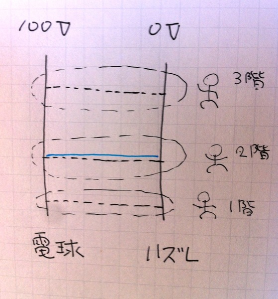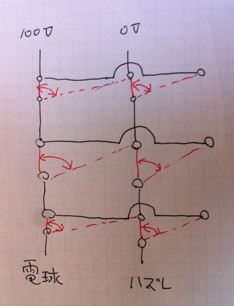 そんな「?マーク」が頭に頭詰まったこどもでも、右のような(たった2本縦線の)あみだクジ=「電源から電球にたどりつけるか、というあみだくじ」を見せ、「このあみだくじの途中3箇所に人がいて、電球のOn/Off=電源から電球に辿り着けるかーを切り替えたいとしたら、どうする?」と尋ねれば、「そんなの簡単だよ!横線を引っ張るか、引っ張らないかで、切り替えることができるよ!」と名探偵コナン風に答えることができそうな気がします。