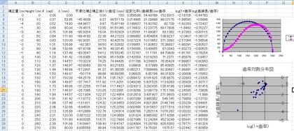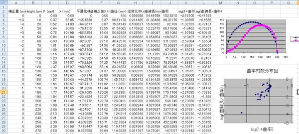 作成したエクセルシート(Excel 2003以前版と2007版は、日をおかずサーバからダウンロードできるようにしようと思います。とりあえず、今回のエクセル・シートで作成したグラフが下の図になります。左のグラフが「半球形状バスト(赤線)」と「作成形状バス(青線)ト」で、右のグラフがどれだけ「美的曲線」に近いかを示す曲率対数分布図です。