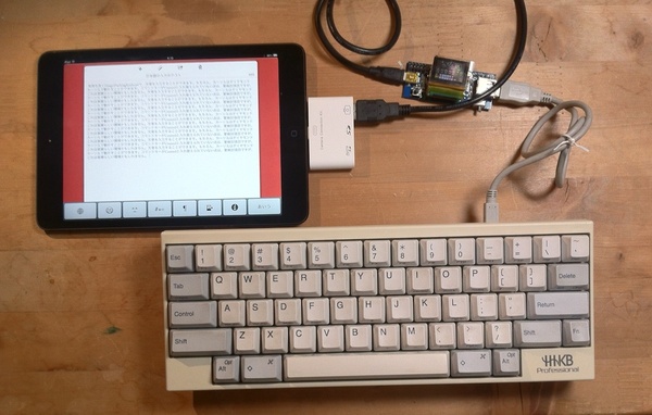 ところが、iOS にはキー入れ替えを行う機能がありません。そこで、Happy Hackingキーボード(USBキーボード)とiPad mini(PC)の間に「キーコード変換などを行う基盤(はかどるん)」を挿入し、Controlキーとコマンドキーを入れ替えてみました。そのようすが、下の写真です。