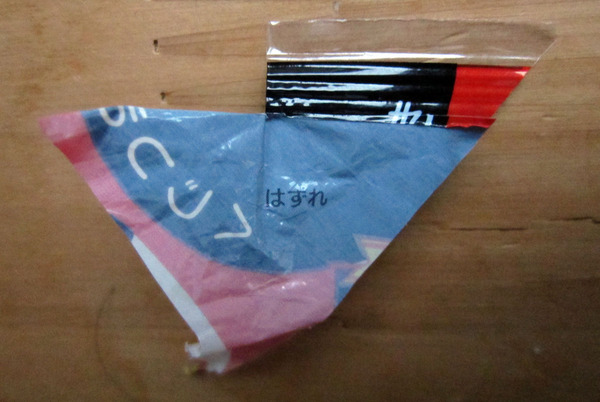 アタリ・ハズレ透視術のやり方は、とても簡単です。アタリ・ハズレが書いてある印刷部分が、あたかもピラミッドの頂点状になるように折り込み、その”よっちゃんイカピラミッド”内部に光が差し込むように照明に向かってかざしてみれば、アタリ・ハズレが浮き出てくる…という具合です。当たり前と言えば当たり前の話過ぎるかもしれませんが、そんな風によっちゃんイカを光にかざしてれみば、たとえば右下の写真のようにアタリ・ハズレが浮かび上がってきます。(浮かび上がっているのはアタリではなく、ハズレですね…)