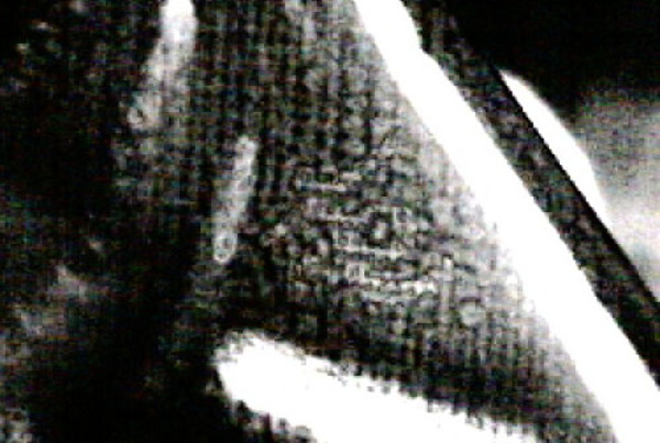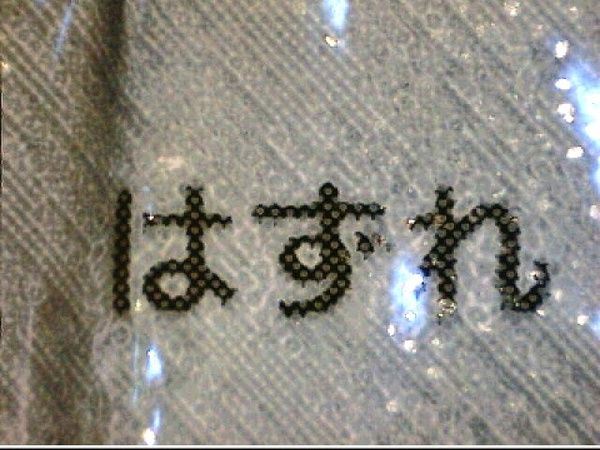 よっちゃんイカの(アタらなかったので)ハズレ印刷を顕微鏡で眺めてみると、一見、中間調の黒インクで印刷されているように見えます。しかし、さらによく眺めてみると、アタリ・ハズレを描いているのは、黒インクではありません。よっちゃんイカのビニール包装の上には、まず白インクによる印刷がされた上で、その上に黒インクによる印刷がされていて、アタリ・ハズレを描いているのは実は黒インクではなく白インクの方なのです。
