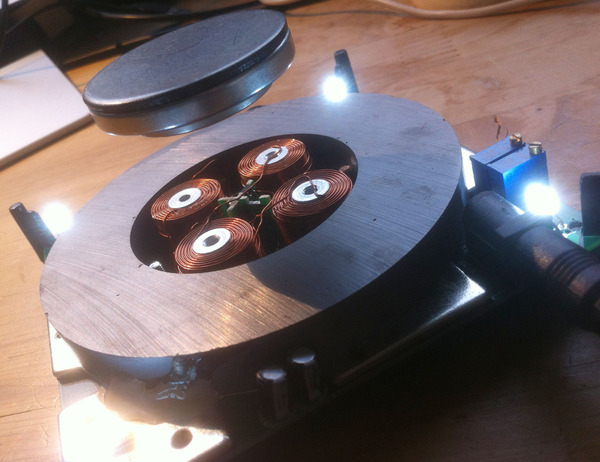 内部をスケルトンに眺めてみると。下の写真のようになります。浮いてる物体の中には磁石がいて、下部の床下には、(浮いてる磁石を引っ張る)リング磁石が1個と(リング磁石を浮かべ・位置制御するための)電磁石が4個隠れています。そして、装置中央にあるセンサで浮かせた磁石の位置をセンシングしつつ、電磁石の強さをフィードバック制御することで、静止浮上させるという仕組みです。