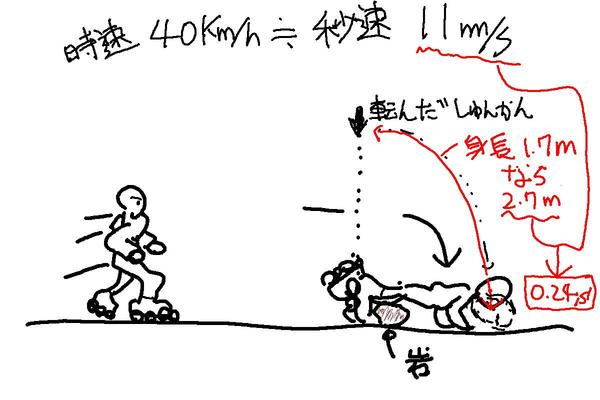 つまり、とても大雑把に単純化されていて、身長1.7mくらいの人が時速40km≒秒速11mで滑っているときに、いきなり車輪がロックしたとする。そして、足先を中心にして頭の先が秒速11mで(1/4の)円運動をして地面に衝突・・・という状況である。「(1/4の)円周」の長さが、身長1.7mの人ならおよそ2.7mになるので、(秒速11mなら)車輪がロックしてから地面にぶつかるまでは「0.24秒」ということになる。「転んだ瞬間」=「0.24秒」なのである。短いけれども、転びつつある頭の中では結構長く感じられそうな、微妙な時間である。