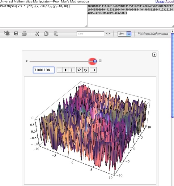 そんな、シンプルかつ美しいアイデアを実装してしまったのが"Universal Mathematica Manipulator—Poor Man’s Mathematica"です。任意のコマンド(数値)群を自然数に変換し・その自然数を逆変換させた上で(Wolfram CDF 実行環境に)動かさせるというUniversal Mathematica Manipulator—Poor Man's Mathematica