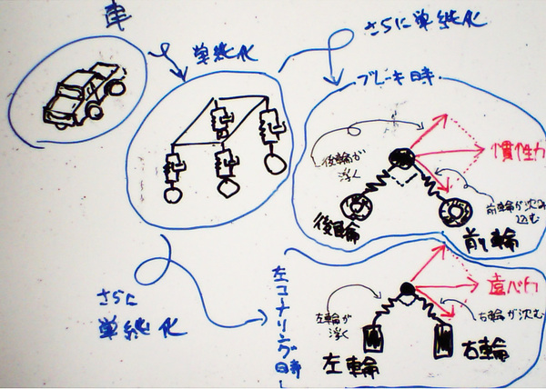 つまりは、ブレーキをかけた時に働く慣性力や、コーナリング時に働く遠心力が、90度直行する2本のサスペンションにそれぞれ分配される、というモデルである。こんな単純なモデルであると、図の右の方に書いたように、ブレーキ制動時には前輪が沈み・後輪が浮き、左コーナリング時には「右輪が沈み・左輪が浮く、ということになる。