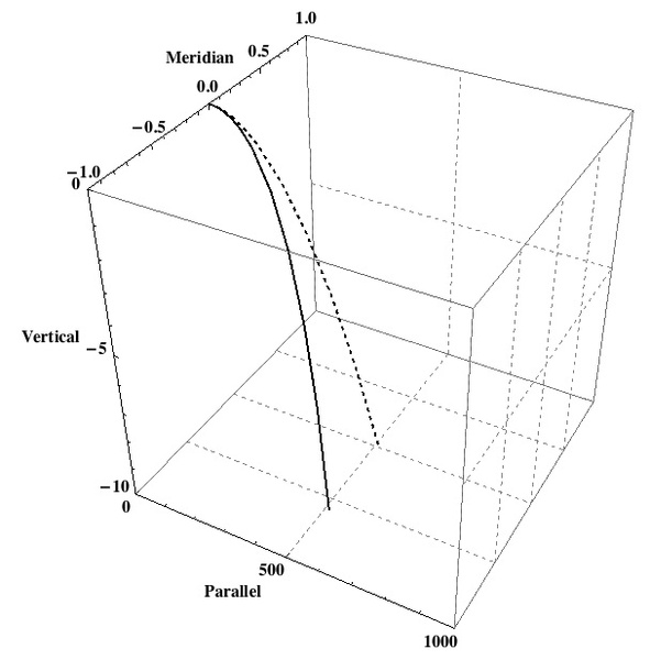 このグラフを眺めると、銃弾が南北方向に1000メートル進む間に、鉛直方向に対して5メートル落ち、そしてコリオリ力により、東京では0.8メートル・赤道では1メートルほど弾丸の軌跡が東方向に曲がってしまっていることがわかります。…なるほど、ゴルゴ13ほどの超長距離狙撃ミッションを遂行するスナイパーともなれば、弾丸に働く空気抵抗や重力だけでなく、地球の自転・コリオリ力すら考えに入れないといけなかった!というわけです。