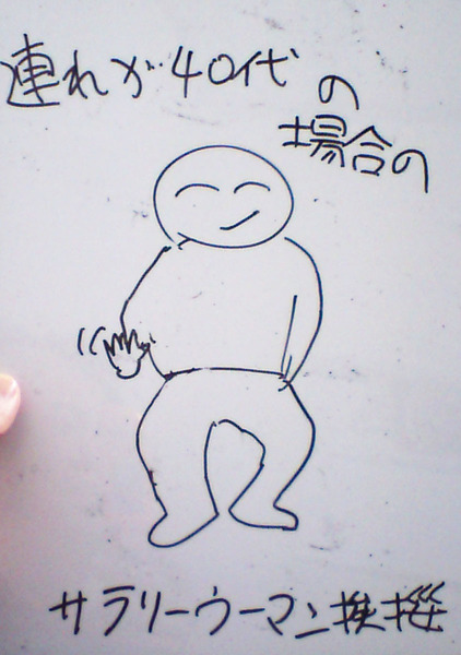 連れが40代のサラリーマン(ウーマン)の場合、両手でなく片手だけを腰辺りの高さで振る理由は、その観察から明らかにすることはできなかった。それは、もしかしたら、(自分の、あるいは、相手の連れに気を使い)手を振る行為をさらに目立たせたくなかったせいかもしれない。……あるいは、もしかしたら、腰の高さで両手を振ったとしたら、ペナルティ・ワッキーの「芝刈り機」状態になってしまうかもしれない。