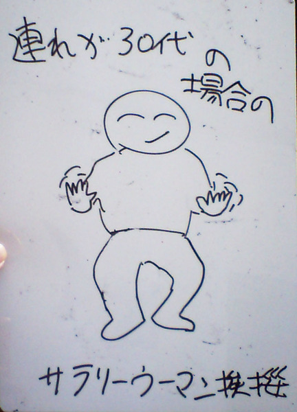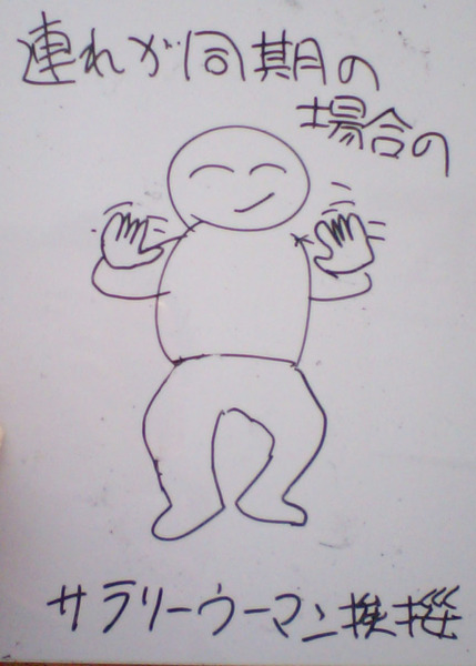 - 30代のサラリーマンと20代のサラリーウーマンが、同期らしき(20代の)サラリーマン・ウーマンのグループとすれ違う時には、(知り合いを見つけた)サラリーウーマンたちは、互いに「両手をへそ辺りの高さで、掌を揺らすポーズ(バイバイのポーズ)をする」