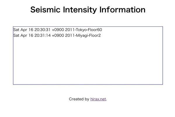 …たとえば、「各クライアントPCが震度情報をサーバに送信すると同時に、サーバは他の場所での震度情報(警告情報)をクライアントに教えてあげる・クライアントはどれと同時にビープ音を発する」「建物の何階にいるかということと震度情報の対応を算出する」「全国の震度情報をGoogle Maps上にリアルタイムレンダリングする」…たくさんのアイデアを量産実装したいものです。