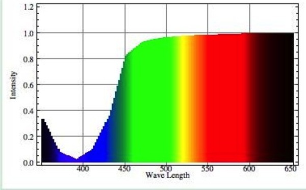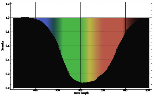 まず、ビールに溶け込んでいる(光を吸収しても散乱はさせない)成分の分光吸収率が右のような吸収スペクトルだとしてみます。「ビールといえば黄色」ですから、ほぼ黄色以外の波長の光を吸収するような特性です(グラフの黒領域が吸収される量を示しています)。