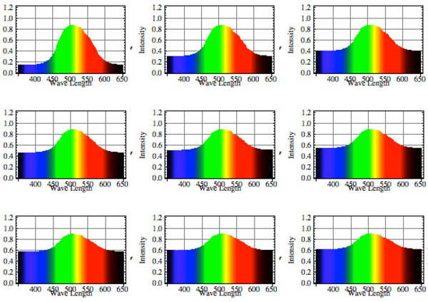 そんな「黄色いビール」の中に含まれる濁り成分量を「全然入ってない~たくさん入ってる」まで9段階の条件下で、「ヴァイツェンビールの濁り成分量と外見色の関係式」を使って「ビールグラスの外見色(スペクトル)を算出してみると次のようになります。左上が濁り成分が全然入っていない状態で、右下がたくさん濁り成分がグラスの中に入っている状態です。