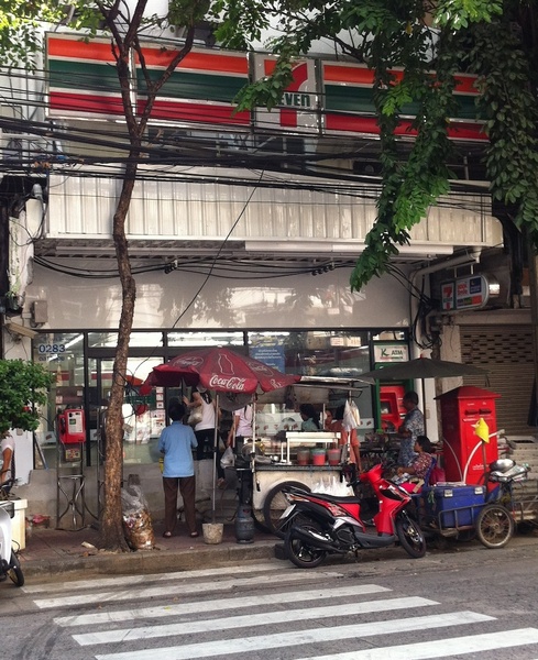 右の写真は、「セブンイレブン」の店頭を写した写真です。いたって普通の景色ですが、「ひとつだけ」違和感を受けるかもしれないものが映っています。それは、店の前を覆う「コンクリート壁」です。水が店の中に入らないようにと、店を囲うように1mほどの壁が作られていています。セブンイレブンの店の中に入る人たちは、ヒョイヒョイと土嚢で作られた”階段モドキ”を上り、小高いコンクリ壁をまたいでいくのです。こんな「防水城壁」が店の前・家の前に作られていることも多いので、まるで「街中にある色んな道」の周りに「堤防」が作られたような状態になっています。