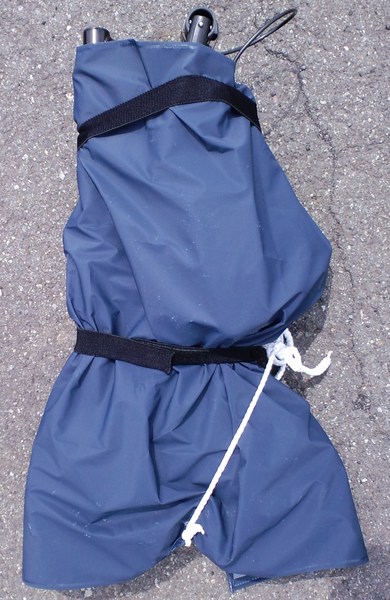 それが、下の写真の「輪行袋」です。「100円」というコストを考えた上での、コストパフォーマンスを考えれば、なかなか良い感じです。