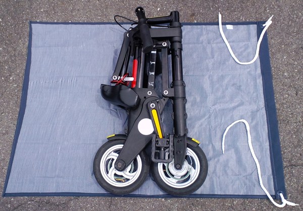 そこで、とりあえず、マジックテープ3本で「ハンドル部分」「ペダル部分」「タイヤ上部」を固定し、「中身丸見え」で輪行するという具合にしてみようか、と思っています。それが、右の写真です。A-bike(型自転車)を折りたたむと、ベビーカーよりも遥かに小さく邪魔にならないサイズになりますから、少し人目を惹かないように、あるいは、他の人に触れた時にも大丈夫なように、クッション性のあるもので覆い、その周りをマジックテープで固定するくらいで良いかな、という具合です。