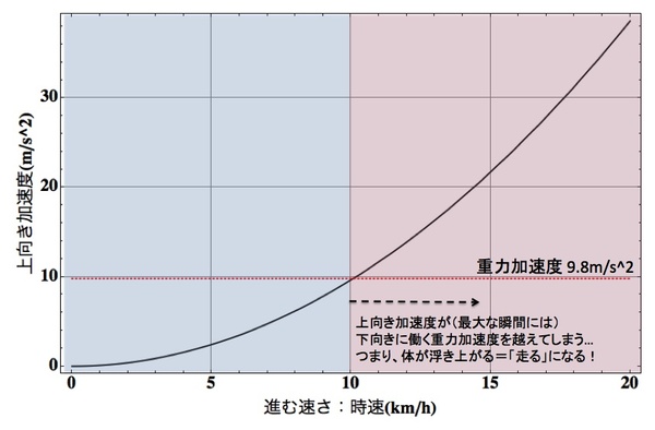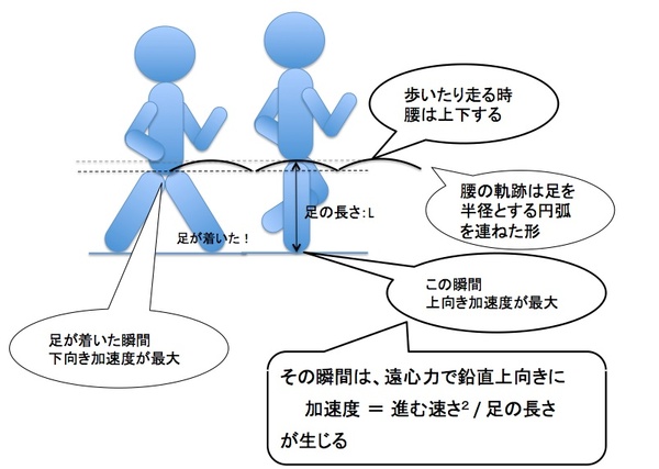 つまり、私たちが時速10km程度で歩こうとしても、足 が伸びきった瞬間に私たちの体は浮かび上がってしまう=走り出してしまう、ということがわかります。(中略)