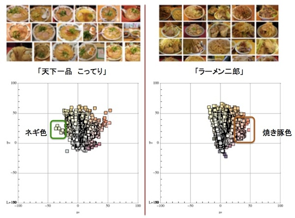 見た目(色)だけで言えば、ラーメン二郎と天下一品のスープはかなり似ています。しかし、Googleで「天下一品 こってり」と「ラーメン二郎」でイメージ検索をかけた結果(左下:”天下一品 こってり”のイメージ検索で得られた画像群、右下:”ラーメン二郎”のイメージ検索で得られた画像群)を色解析してみると、実は「区別するための手がかり」があります。