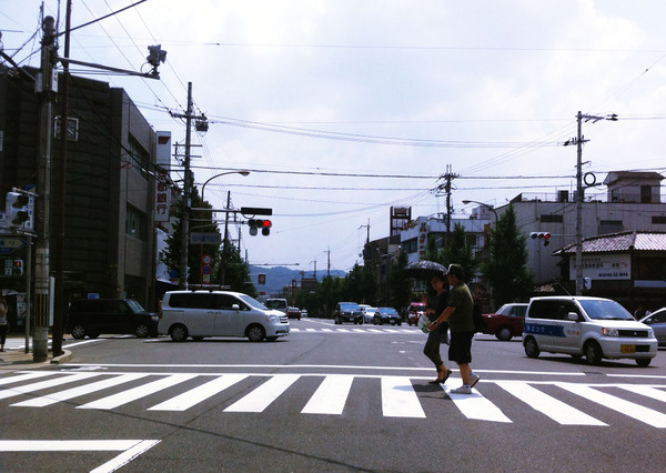 夕べ食べた天下一品のこってり(並)と餃子が腹にもたれ朝飯抜きで桂から松尾に向かい、嵐山から北王子を回って天下一品本店の前を通ります。…やっぱり人が何人も並んでいて、北バチ跡もテニスコートが屋上にあるラブホもなくて、少し残念に思いつつ南へ向かいます。そして、北白川今出川で信号待ちをしながら、ビートルズの「アビーロード」のジャケット写真みたいな景色を眺めます。