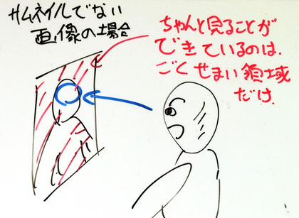 2.視力の視野依存性により、サムネイル画像では(大きな画像の場合には認識できない)顔全体を確認できてしまい、顔造形の不自然さが認識されてしまう