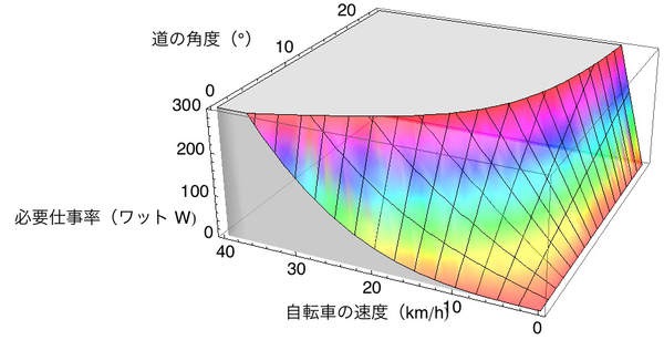 その坂道の辛さを(体だけでなく)頭でも実感しようと、「道の斜度」と「自転車の時速」から、必要なパワー(ワット=W)を大雑把に計算してみました。その結果が、下のグラフです。
