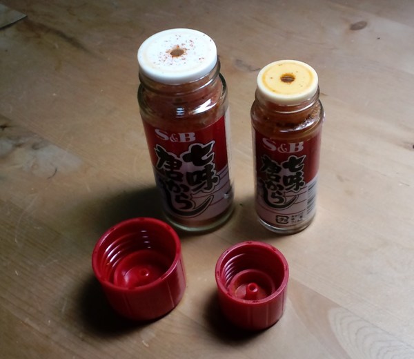 七味唐辛子も日本食の代表的な調味料のひとつです。日本食で確かめる「ブラジル・ナッツ現象」を考えるなら、柿ピーだけでなく七味唐辛子も必須のような気がします。S&Bの七味唐辛子容器をシャカシャカ振って、上下ひっくり返してみたりして、容器中の香辛料がどんな分布になるかを調べてみると面白いかもしれません。