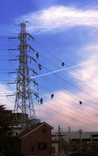蒼く染まった空の下を、地上数十メートルの高さを、高圧線にぶら下がりながら鉄塔の間を移動するのは、一体どんな心地なのでしょうか。遙か遠くの発電所から、山を越えて谷を越え、何百kmもの旅をして、あなたの部屋まで届く電線にぶらさがって、鉄塔の間を少しづつ動いている人たちがいます。