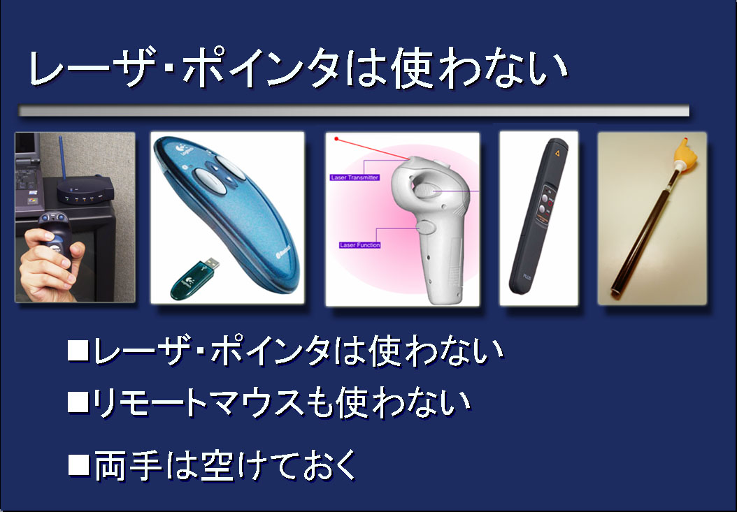 と、書くだけでは情報が少なすぎるようにも思いますので、適当なスライドと資料の一部を載せておきます。ちなみに、ネタ用に市場に出回っている各種リモコンマウス系はほぼ全て持ってはいます。とはいえ、「レーザーポインター」としてはもちろん使いません。リモコンスイッチとして時折使うこともありますが、それらを実際に使う状況はごく限られた場合です。ネタとして見せる場合か、主催者がよほどヘンな配置をした場合か、だけですねぇ。