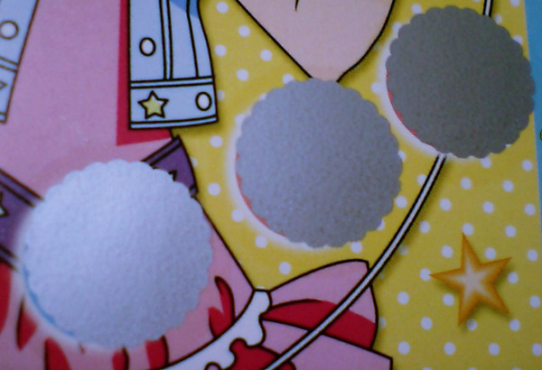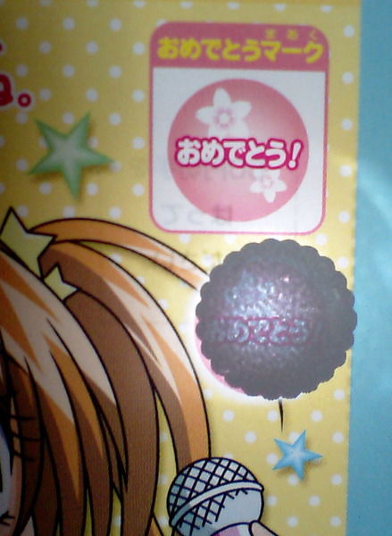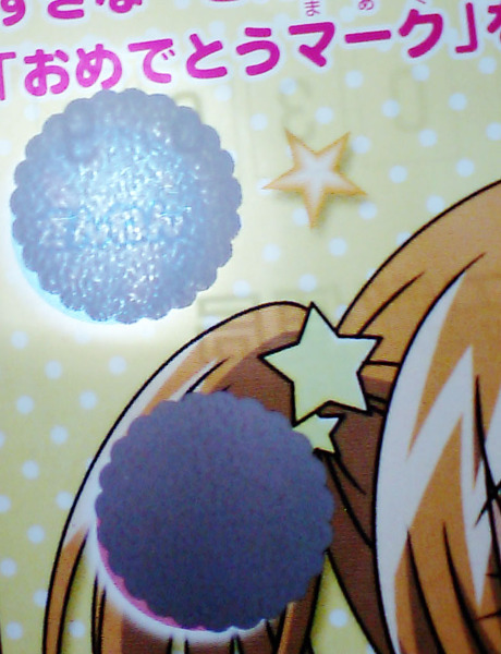 こういった「銀スクラッチ」は、後ろから強い光を中てると「(銀スクラッチの下に隠されている)こたえ」が浮かび上がって見えるものが多い。この小学一年生 四月号のプレゼントクイズの場合も、やはり後ろから光をあてると、答えが透けて見えてくる。右の画像は、きらりん☆レボリューション のイラストを白色LEDで背後から照らすことで、「あたり」と「はずれ」を透かし見た場合である。朱色インクで印刷された「あたり」と藍色インクで印刷された「はずれ」という文字が、やはり浮かび上がって見えることがわかる。