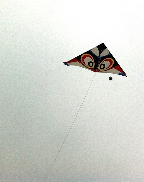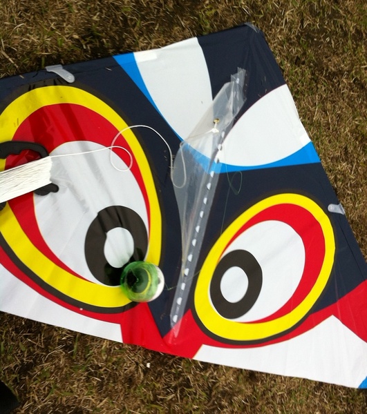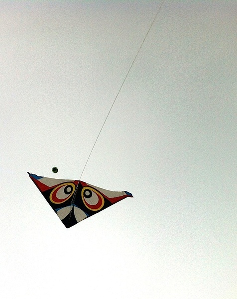 ケースを含めてWifiカメラの重量は20グラム程度です。そのカメラを100円ゲイラカイトにぶら下げて、かすかな春風に凧をさらしてみると、カメラの重さをものともせずに、凧は空に高く浮かんでいきます(右写真)。