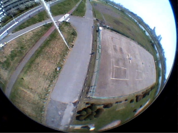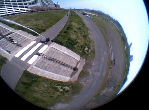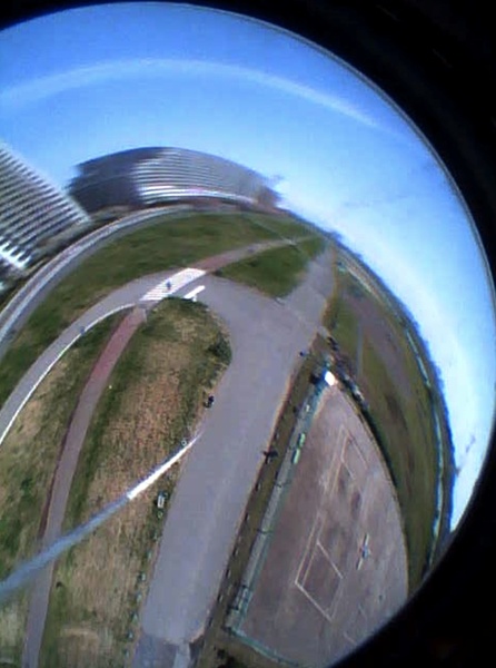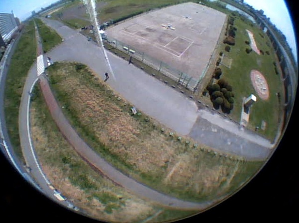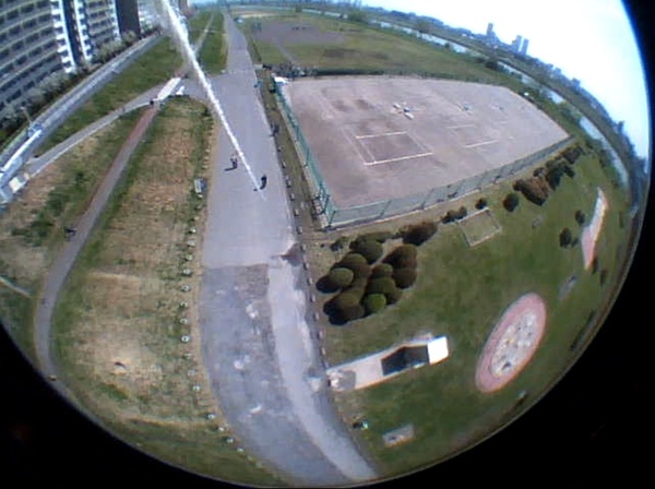 100円ゲイラカイトにぶら下げた超小型Wifiカメラに広角レンズをとりつけて、3月終わりの春風に乗せて、ゲイラカイトを頭上に浮かべてみました。