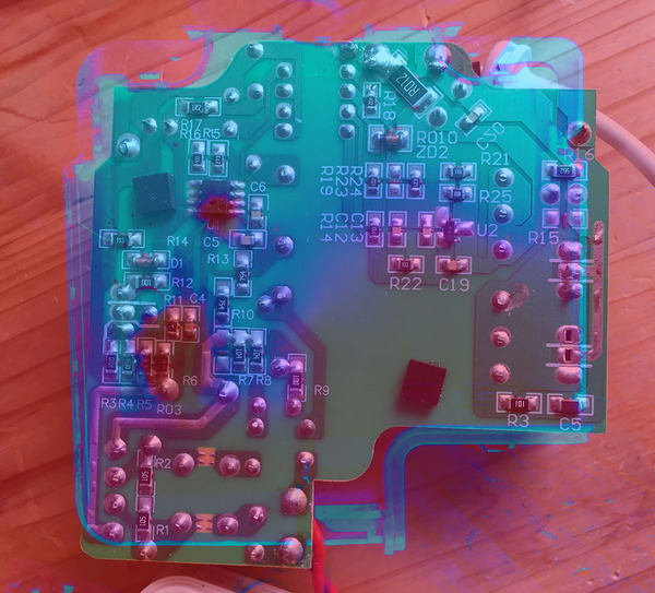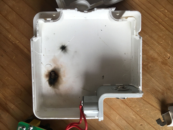 朝、Apple Macbook Pro用で使っていたACアダプタが、バチン!と音を立て、電流を供給しなくなった。つまりは、壊れたのでケースを開けてみた。長ネジとナットを使いケースをこじ開け開腹してみると、ケース内側に2箇所焦げ付いた箇所がある。右の画像がACアダプタ内側で、右下の画像が、基板とケースを重ね合わせて示したものだ。