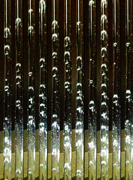 「バブルジェットなディスプレイ」を作ってみよう!?というわけで、今日は(横幅12ピクセルの)文字を泡ディスプレイに描画してみました。…といっても、泡ディスプレイ用の泡パイプはまだ一本しか作っていないので、泡として出力する走査位置を変えつつ12回分出力して、(そのさまを撮影した写真を)完成イメージ風に合成してみました。それが、右に貼り付けた写真です。(参考:高粘度液体中の空気泡は「インクジェットプリンタのインク滴挙動」と同じです!?)