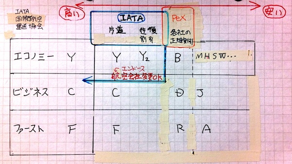 航空券の「値段」や「日程・便などの変更可否」について全然知らなかったので、航空券について詳しい方に「個人授業」をして頂ました。その授業中にとったノートの一部が下の画像です。走り書きなので、省略箇所や間違っている箇所は多々あるかと思います。