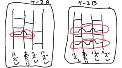 前回紹介したように、あみだくじのアタリの場所がわかっている時には、その(平均的な)動き方を1次元の拡散方程式で解くことで、(平均的には)ここがアタリやすい場所だ、ということを求めることができます。アタリの場所が中央でなく、横線が十分にたくさんある場合には、アタリが左に寄っているなら左端、アタリが右に寄っているなら、右端がアタリやすい場所になります。横線の数が少なく、アタリが端にそれほど近くない場合には、アタリの真上がアタリの確率が高くなります。