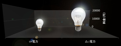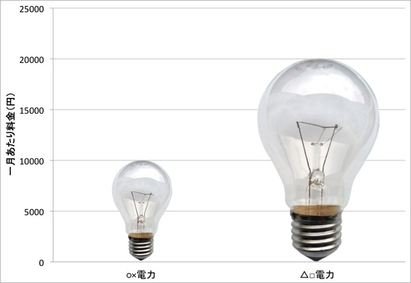 「一月あたりの電気料金を比べてみると、△□電力は○×電力の2倍(前者が1万円で後者が2万円)」なのですが、その「2倍」の違いが「3〜5倍程度」に感じられます。それはもちろん、このグラフが「電球の高さ」を用いて電気料金を表現しているのに、その高さに応じて電球の幅まで変えているからです。