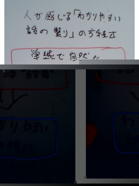 ところで、手書きで「言いたいこと」を描くよりも、コンピュータを使って資料を作る方がずっと時間がかかるように思います。しかも、プレゼンテーション・ソフトウェアで図を作ったりした日には、「考えていること・言いたいこと」がメリハリがつかなくなり、わかりにくい資料になってしまうことが多いようにすら思うのです。不思議なような気もしますが、そう私は感じています。