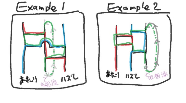 横線同士が交差していたり、同じ縦線同士を繋ぐ線の後ろに「仮想縦線」が隠れていると考えてみると、あみだくじの「(スタート地点とゴールとの)一対一対応といった特性はそのままに(それ以外の特性も前回考えたようにそのままに)、「あみだくじの無限ループ線」が存在しうる、ということになります。