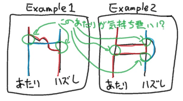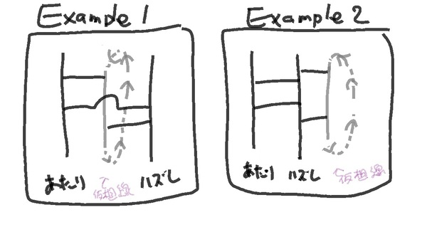 この「時空間を歪ませるようなスペシャル線」は一体どう扱う・どう考えれば良いのでしょうか?そんなに考え込むことでもないのかもしれませんが、あみだくじというものを考えるとき、「通らない線がある」「横線に対して、(両方向に進む経路があって欲しいのに)片方向に進む経路しかない」「線を追いかけていくと、下から上に遡らなければいけない部分がある」というのは、あまりに「おさまりが悪いこと」であるように思われます。