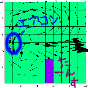 また、これらの場合の計算結果を動画で示したものをMPEG4形式のAVIファイルとReal形式のファイルにしたものを以下に置いておく。エアコンから空気が送られる様子を知るには、何はともあれこの動画を見て頂きたい。なお、手元のRealProducerの制限のために、このReal形式のファイルは古いバージョンのRealPlayerだとアップデートが必要になってしまった。また、MPEG4のCodecが導入されていない場合には、DivXなどをインストールする必要がある。