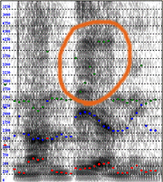 まずは、京都市の西の辺りに居住する人の「なんでやねん。」を示してみようわ。ちーとばかし、ツッコミの気持ちが強い「なんでやねん。」であるちゅうわけや。ツッコミの気持ちが強いために、前半「なん」と後半「でやねん。」がちびっと分離気味であるちゅうわけや。