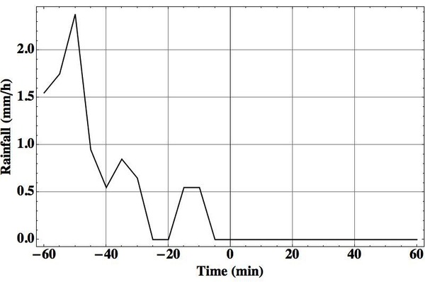 そのXMLをパースすると、たとえば下のような(横軸が時間=分、縦軸が降雨量を示した)降雨量推移・予測グラフを描くことができます。5〜10分刻みの(過去の)降雨量推移や、あるいは未来の予報を知ることができるなら、日々刻々の私たちの判断も、それに応じて(ほんの少しだけ)最適化されていくかもしれないですね。